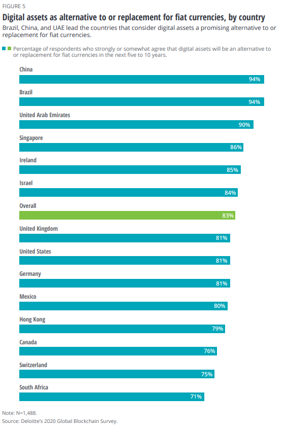 德勤在报告中将数字资产定义为“以数字形式表示的具有内在价值或获得价值的东西”。据其调查,中国、巴西和阿联酋在那些认为数字资产是法定货币的替代或替代法定货币的国家中处于领先地位。图表中按照国家划分,统计了那些认为数字资产将在未来五到十年内替代法定货币或替代法定货币的受访者的数据。